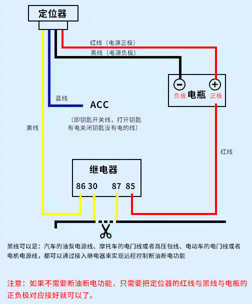 一般的遠(yuǎn)程斷油電繼電器有4根線(按下圖的接線來(lái)講解,其它的繼電器原理相同,只是顏色有部分差異):首先,紅色線接車上長(zhǎng)供電正極,黑色線搭鐵,藍(lán)色線接鑰匙孔的ACC線上就是車鑰匙打開(kāi)有線關(guān)閉沒(méi)電的線上。其次,如果要實(shí)現(xiàn)斷油電功能,還要接下面幾條線,設(shè)備黃色線接繼電器的黃線,繼電器的紅色線接車上的長(zhǎng)供正極線,兩條黃色線分別接油泵供電線剪斷后的兩端。
